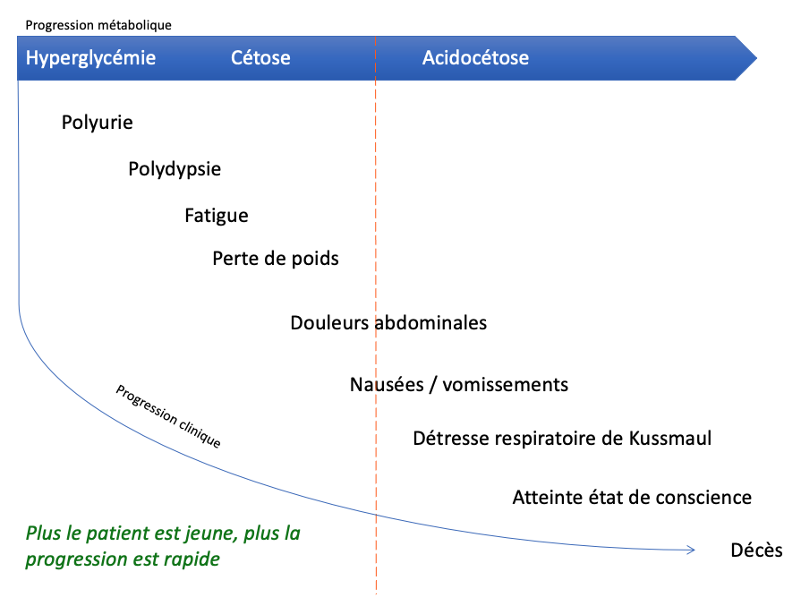 Une infection peut précéder le diagnostic de diabète de novo, sans en être la cause. En recherchant au questionnaire les symptômes typiques (polydipsie, polyurie, polyphagie, perte de poids), le diabète apparaît plus évident comme diagnostic à poser. Attention aux diagnostics qui peuvent être associés à ou mimés par le diabète: gastrite, infection urinaire, asthme, appendicite.
